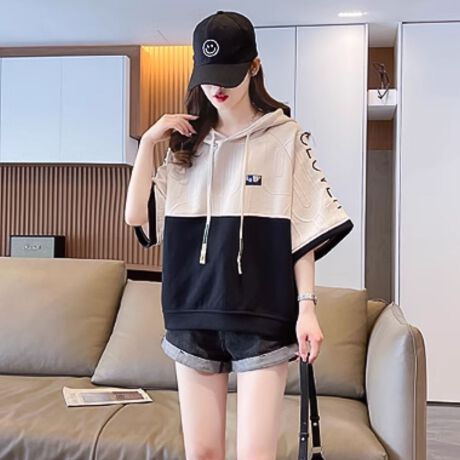 【バイカラー半袖フードパーカー】