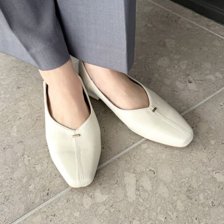 V字カットの履き口とセンターシームが足元をすっきりと見せてくれるデザイン。