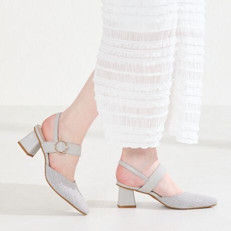 踵ストラップは隠しゴム仕様で着脱が楽にできるうえ、太めのヒールで安定感も抜群。
