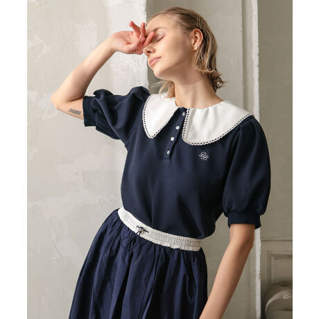 大きめの丸襟にあしらった繊細なスカラップレースが、