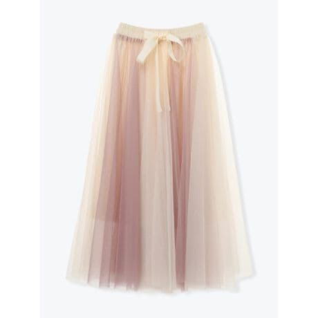 [型番:26550731663]やわらかな透け感を楽しめるチュール配色生地が可愛らしさを演出するスカート。ウエストに施されたリボンがコーディネートのワンポイントになります。タックインスタイルも楽しめるゴム仕様が魅力。シンプルなトップスと合わせて、ボトムスを主役にしたスタイリングがおすすめです。