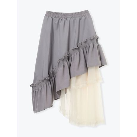 [型番:26550733651]アシンメトリーなフリルとチュール切り替えがガーリーなムードをプラスするスカート。裾に向かってたっぷりとボリューム感があり、立体感のある着こなしを楽しめます。ウエストゴム仕様でラクな穿き心地を実現。休日のお出かけコーデに大活躍してくれるアイテムです。