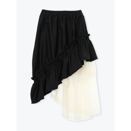 [型番:26550733651]アシンメトリーなフリルとチュール切り替えがガーリーなムードをプラスするスカート。裾に向かってたっぷりとボリューム感があり、立体感のある着こなしを楽しめます。ウエストゴム仕様でラクな穿き心地を実現。休日のお出かけコーデに大活躍してくれるアイテムです。