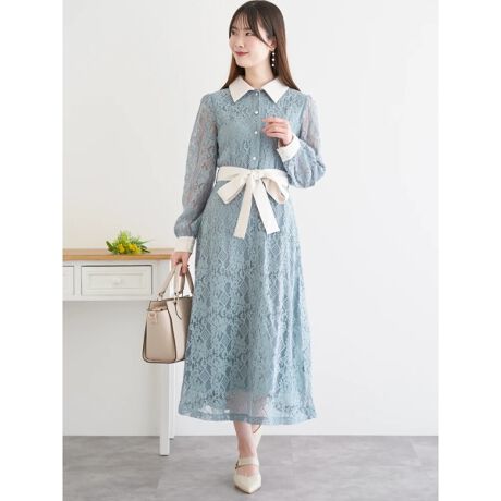 [型番:26550727498]繊細な総レース生地で仕立てられたクレリックワンピース。襟やウエストリボンの配色がアクセントとなり、上品な印象をプラスします。裾に向かってなだらかに広がるフレアシルエットが女性らしさを演出。1枚で休日のお出かけコーデが完成するアイテムです。モデル(青着用)身長:160cmMサイズ着用