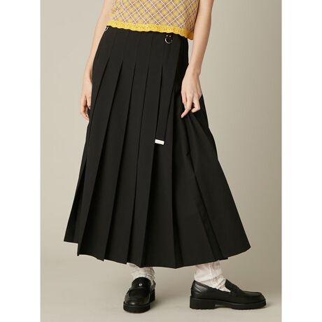 薄手のスーツ地ライクな素材でお作りしたプリーツスカートです。新鮮な長めの丈感でトレンドのトラッドスタイルコーディネートに活躍するアイテム。着用した時に腰回りがスッキリ見えるようにプリーツは腰のあたりまで中縫い仕上げをしております。ベルトループのDカンと別ベルトの金属バックルベルトによって程よくモードな雰囲気もあるのがポイント。後ろウエストはゴム仕様で着心地も良いです。