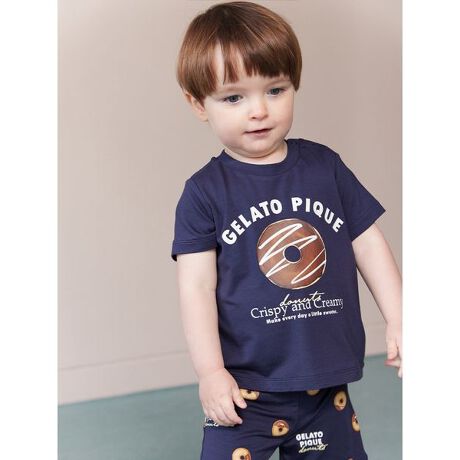 甘いチョコレートコーティングのドーナツをクールなカラーリングで表現した、POPでカジュアルなBABYサイズのTシャツです。フロントにドーナツの絵柄、背面にドーナツのレシピをプリントした遊び心たっぷりのデザイン。春からの季節にうれしいなめらかな接触冷感のレーヨンを使用し、おしゃれと機能性を両立しました。同シリーズのハーフパンツを合わせたり、HOMMEやKIDSサイズとのリンク・コーディネートもお楽しみいただけるアイテムです。