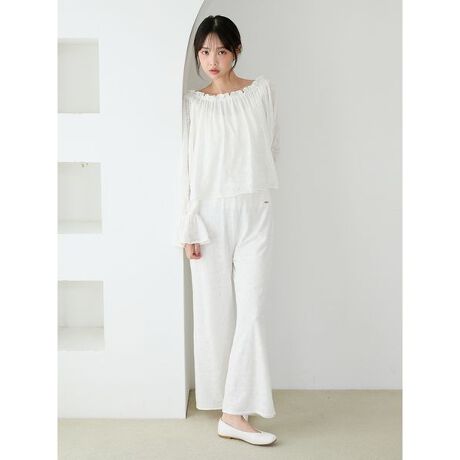 毎年春に大好評のさくらコレクションが今年も登場。青空いっぱいに咲き誇る八重桜の花を、オリジナルのレーシーなジャガードで表現したシリーズです。ほんのりとした透け感に春を感じる、裏地付きのロングパンツ。桜柄が入った軽やかなジャガード生地が、花びらのようにふんわりと身体に寄り添います。フリルが付いたウエストと、裾に向かって程良く広がるきれいなシルエットもポイント。色はオフホワイトとピンクの2色をご用意しました。同シリーズのプルオーバーとのコーディネートがおすすめです。