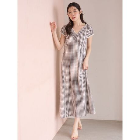 深めのVネックとや袖口にレースをあしらったカップインタイプのワンピース。