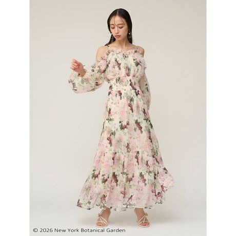 このスペシャルな総柄を、横筋で表面感を加えた柔らかで軽やかなオーガンシフォン生地にプリントしてお作りしたギャザープリントロングワンピースです。