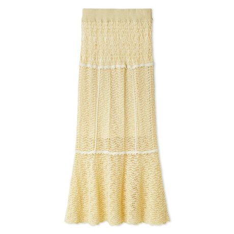 コットンやキラキラと輝くスパンコール糸を撚り合わせた華やかな糸を使用した、マーメードシルエットのクロシェニットスカートが届きました。横に流れるような繊細な柄編みを取り入れ、エレガントに仕上げています。腰回りはすっきりとしたタイトシルエットで、縦の配色切り替えがすっきりとした印象を加え、美スタイルを演出。クロシェニットトップス(SWNO261156)と同じ編地でお作りしており、セットのでご着用もおすすめ。ウエストは総ゴムで、着脱しやすいデザインです。
