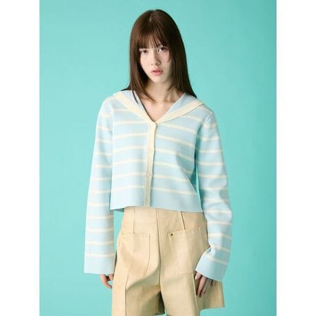 マリンテイストのセーラーカラーを取り入れたボーダーカーディガン。しっかりとしたミラノリブで編み立て、ジャケットのような着心地を実現。肩から裾までのラインが整い、さまざまなトップスやボトムと組み合わせやすい1枚。