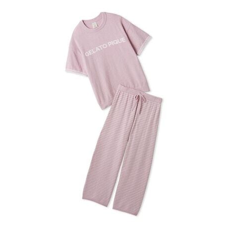 なめらかな肌触りで愛される定番ニット’スムーズィー’を使用した、毎日カジュアルに着用いただけるセットアップです。袖にラインを入れたロゴジャガード入りの半袖プルオーバーと、細めピッチのボーダー柄がおしゃれなロングパンツの組み合わせ。ストレートのゆったりとしたパンツは、右後ろにロゴ刺繍入りのポケットが付いています。色はネイビーとピンク、グレー、レッドの全4色。ピケらしい可愛い色合いから、落ち着いた色合いまで揃えているので、春の新生活に向けたギフトにもおすすめです。