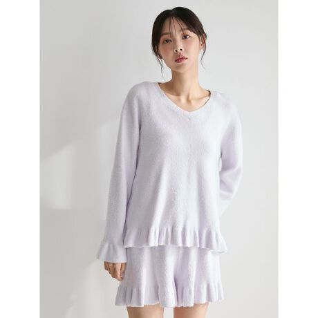 春に似合う柔らかな色合いの’スムーズィー’を使用した、フリル付きのニットシリーズです。裾と袖にお花のようなフリルをあしらった、なめらかな肌触りのプルオーバー。浅めのVネックが上品で、ふんわりした裾がお腹周りをさりげなくカバーしてくれます。左裾にはブランドロゴ刺繍入り。色はイエローとピンク、ラベンダーの3色を揃えました。同シリーズのショートパンツと合わせると、裾のフレアが二重になってより華やかな装いをお楽しみいただけます。