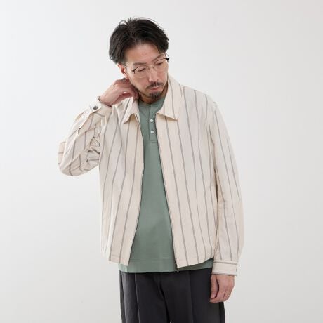 クラブストライプで仕立てられたジャケットは、クラブライフのユニフォーム的な雰囲気を表現しています。