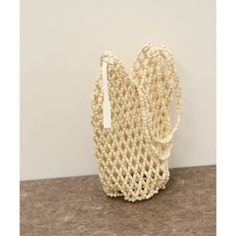 素材の持つ表情を活かしつつ、縦長のフォルムでモードなバランスに仕上げたウッドビースバッグ。