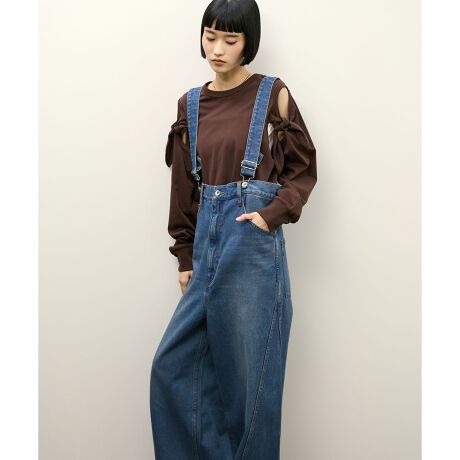 夏には大胆にインナー1枚で楽しめる、通年着用が可能なデニムサロペット。