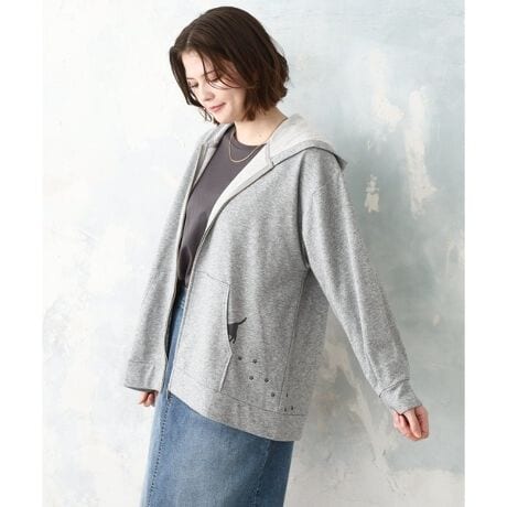 足跡とポケットに入り込む猫のプリントがさりげなく可愛い、大人のためのねこプリントパーカー。