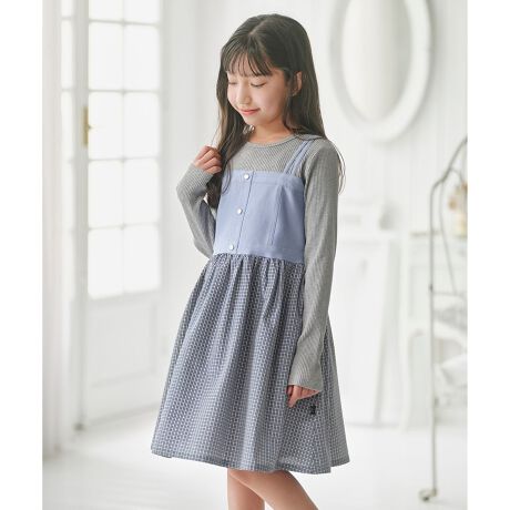 ■デザインリブトップスにデニムのビスチェとチェックのスカートを合わせたたような、一枚でおしゃれなレイヤードスタイルが楽しめるワンピースです。