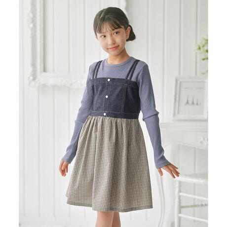 ■デザインリブトップスにデニムのビスチェとチェックのスカートを合わせたたような、一枚でおしゃれなレイヤードスタイルが楽しめるワンピースです。