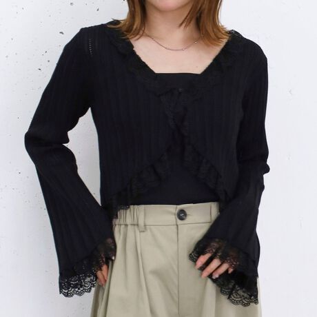 ・ほんのり透け感のあるニットにレースをあしらったカーディガン