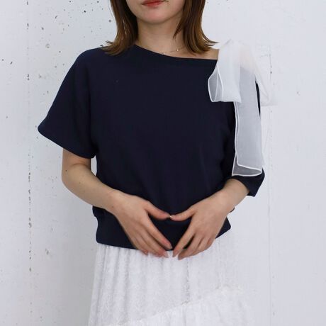 ■甘さをプラスした旬トップス、オーガンジーリボンオフショルスウェット■
