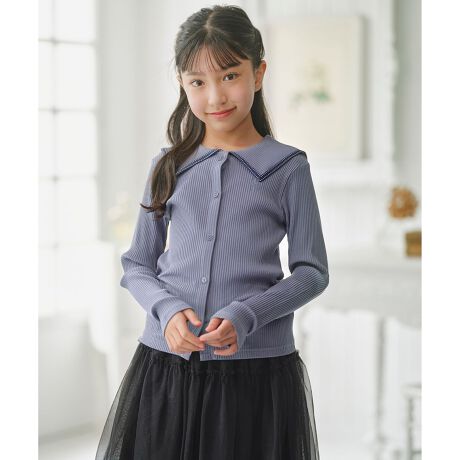 大きめのセーラーカラーの端はテープで囲う始末をポイントにして、前明きのボタンは組曲KIDSオリジナルのロゴボタンを使用しています。