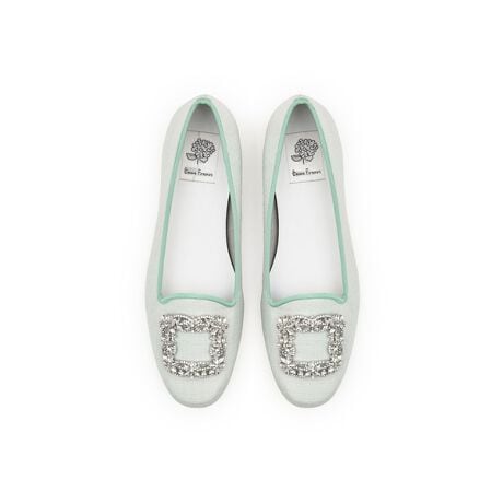 キラッと輝くビジューバックルが、足元を華やかに彩るフラットパンプス。