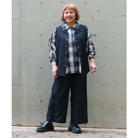 パンツは脇のタック切り替えが縦ラインを強調し、さりげなく細見え効果も◎