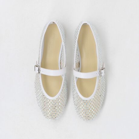 チュールにビジューのついたフィッシュネットを貼り合わせた素材で透け感があり、シーズンムードをぐっと高めてくれる一足です。