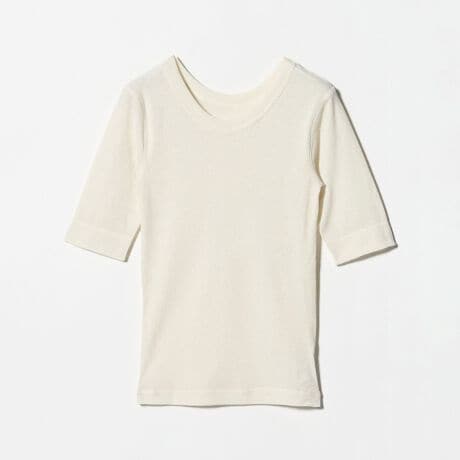 後ろにすれば一見シンプルなクルーネックTシャツでありながら、バックスタイルをヘルシーに演出します。