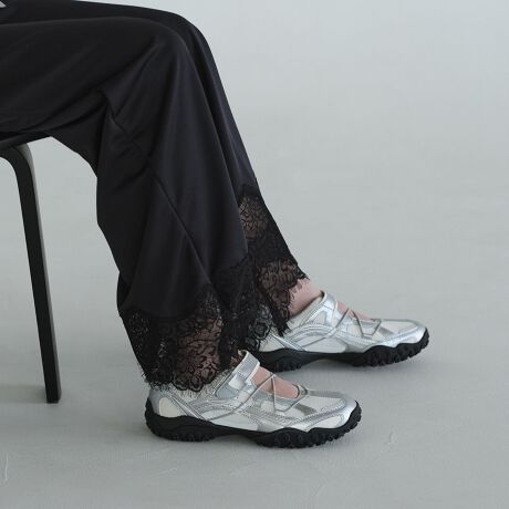 バレエシューズのようなシューレースデザインを配し、スポーティでユニークなムードを醸し出す一足。