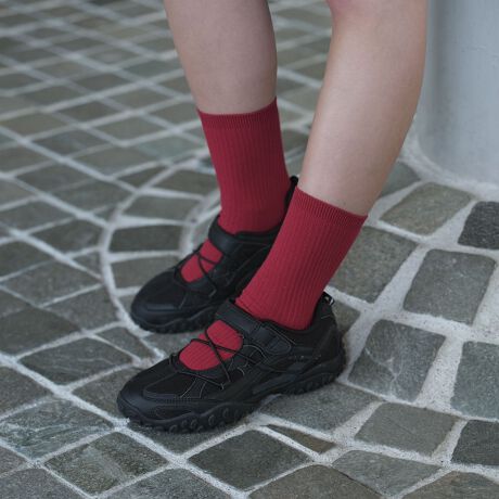 アウトドアテイストの特徴的なソールが甘さを抑え、カジュアルな雰囲気に導きます。