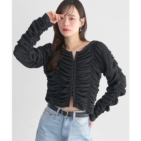 女性らしさを引き立てる、立体シャーリングの魅力フロントに施したシャーリングが自然な立体感を生み、体のラインを美しく見せてくれます。タイトすぎないフィット感なので、締め付け感が少なく、安心して着用できます。ホック仕様のフロントデザインがさりげないアクセントになり、ランジェリーのような繊細さをプラスします。柔らかな素材感で肌あたりが良く、長時間着ても快適です。1枚で主役になるデザインなので、シンプルなボトムと合わせるだけでこなれた印象に仕上がります。ジャケットやカーディガンのインナーとしても使いやすく、レイヤードスタイルにも活躍します。大人らしい可愛さと上品さを兼ね備え、普段のカジュアルコーデを格上げしてくれる一枚です。透け感[ややあり]