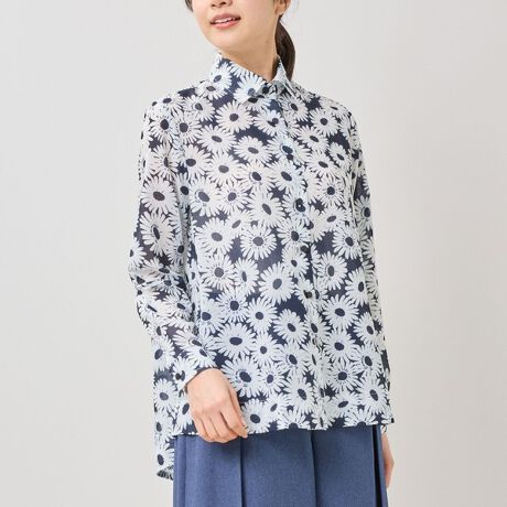 華やかなマーガレット柄をモチーフにしたプリントシャツブラウス。さりげなくNara camicieのロゴが入っているオリジナルプリントです。生地は扱いやすいポリエステル素材を使用。さらっとした風合いの生地に、春の立ち上がりにぴったりなフラワープリントを施し、大人の色使いで楽しめるシリーズ。パンツスタイルと合わせた着こなしや、フレアスカートと合わせたフェミニンなコーディネートもおすすめです。