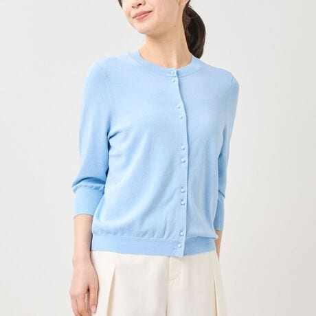 フロントに並んだ煌びやかなパール調ボタンが上品な女性らしさを演出するカーディガン。手元をすっきりと見せる7分袖になっており、スタイリングにシーズンらしさをプラスします。26SSのトレンドカラーであるホワイトのスタイリングには欠かせないシリーズ。