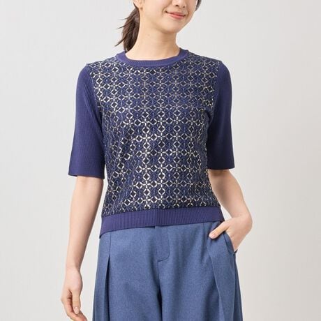 エレガントかつ高級感を演出する、メタリック糸を使用したレースがポイントのニットプルオーバー。スリーブや後ろ身頃はリブ素材で表情の変化をつけ、さらりと着こなせるデザインに仕上げました。