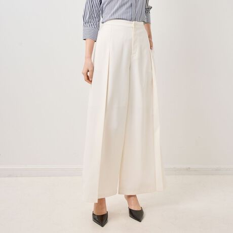 前年好評だったワイドパンツの生地をデニム風にアップデートしたモデル。ウエストから裾にかけてタックを施すことで立体感が生まれ、表情豊かな印象を演出します。春から初夏にかけての季節の変わり目にお使いいただける軽やかな素材がポイント。