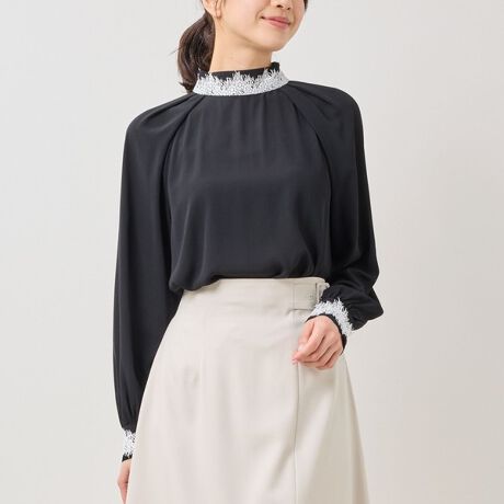 薄めのジョーゼット生地を使用したレース付きプルオーバーブラウス。肩をラグランスリーブにすることで、襟元から施したギャザーがきれいに見えるデザインに仕上げました。袖と襟元に繊細なレースを施し、透明感のある雰囲気を演出。1枚で着用するのはもちろん、オケージョンウェアとしてもお使いいただけます。シーンを問わず、マルチに活躍してくれる1枚です。