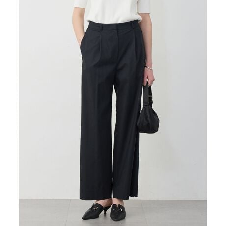 ■デザイン程よい光沢感と軽さが特徴の素材を使用し、快適な穿き心地のタック入りワイドストレートパンツです。ウエスト前脇途中から後ろにかけてゴム入りのスマートバック仕様で、穿き心地の良さにこだわっています。パンツのサイドに生地を挟み込み、横から見た際もさりげない洒落見えを叶えます。