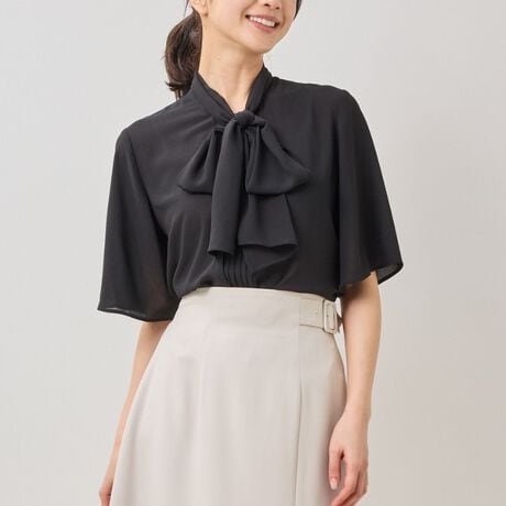 やわらかな落ち感を楽しめる薄めのジョーゼット生地を使用した半袖ブラウス。前身頃にタックとボウタイを施したプルオーバータイプで、スタイリングに華やかなアクセントを添えます。二の腕をきれいにカバーする半袖がポイント。スリーブはややフレアなシルエットになっているため、動くたびに自然な揺らめきを演出します。ボトムスにタックインしたメリハリのある着こなしがおすすめです。