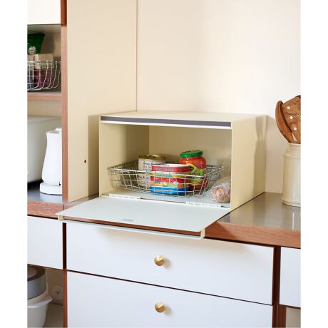 キッチンカウンターなどで雑然としがちなパンやお菓子、調味料などを隠しながら美しく収納できる収納ケースです