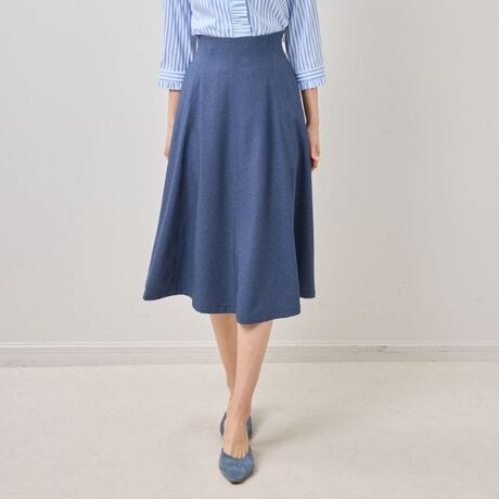 デニム風の見え方をする生地で軽やかな着心地を演出するフレアスカート。ハイウエスト気味のシルエットになっており、身に着けるだけでスタイルアップ効果を演出します。ウエストから腰回りのシルエットはすっきりと、腰から裾にかけてのフレアは分量感もあり、歩くたびに魅せるきれいな動きが特徴的。白とブルーの2色展開で、爽やかなスタイリングを楽しめます。