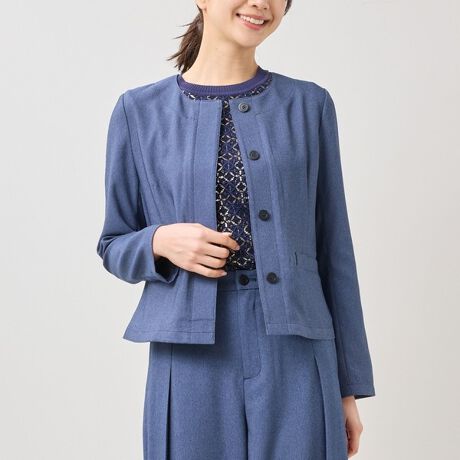 余計なデザインをあえてカットし、シンプルなノーカラーのルックスに仕上げたジャケット。デニム風の見え方をする生地を使用しており、軽やかな着心地を演出します。白とブルーの2色展開で重たくなりすぎず、爽やかな印象を楽しめるのもポイント。