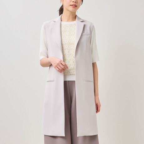 [型番:30-61-25-732]ストレートシルエットと細めの衿をポイントにしたシャープでマスキュリンな新型のジレ。素材のソフトな落ち感にはこだわりつつ余分なディテールを省くことで、様々なインナーと相性の良いデザインに仕上げました。フロントはフック式のためすっきりとした印象を楽しめるのもポイント。ワイドパンツと合わせてもバランス良くまとまる1枚です。・カラー展開はブラック、ベージュ・サイズ展開は1(M)9号・3(2L)13号