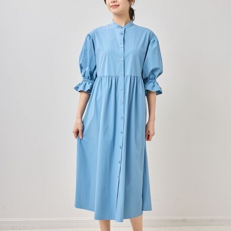 ふんわりとした立体感を楽しめるボリュームスリーブワンピース。高めのウエスト切り替えからのギャザーや袖の分量など、女性らしさを表現できるソフトなボリューム感にこだわりました。首元のバンドカラーのデザインがすっきりとした印象をプラスし、バランスの良いスタイリングを演出。ボタンを開ければ春先に必要な軽さのある羽織りとしても着用できます。