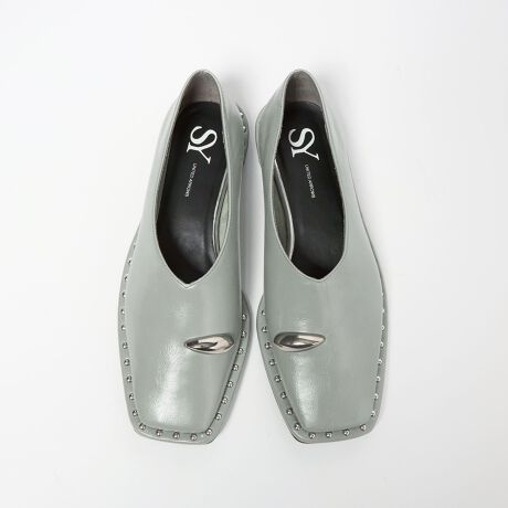 メタルパーツが印象的なスクエアトゥのフラットシューズ