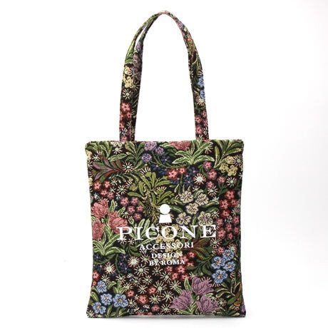 ゴブラン織りならではのクラシカルで繊細な花柄が、装いに上品なアクセントを添える縦型トートバッグ。人気ブランド PICONE ACCESSORI のロゴがさりげないポイントとなり、上品でエレガントな印象です。軽やかな存在感で持ちやすく、A4サイズもすっきり収まる大容量で、日常生活はもちろん、ビジネスシーンにも…シーンレスに幅広くお使いいただけます。224gと軽量で、肩にかけることが出来る長さの持ち手はお出かけに最適です。マグネット開閉で荷物が取り出しやすく便利なのも魅力です。