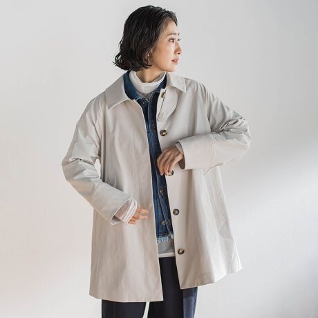 タスランストレッチ素材で仕立てた、軽さと動きやすさが魅力のステンカラーコート。