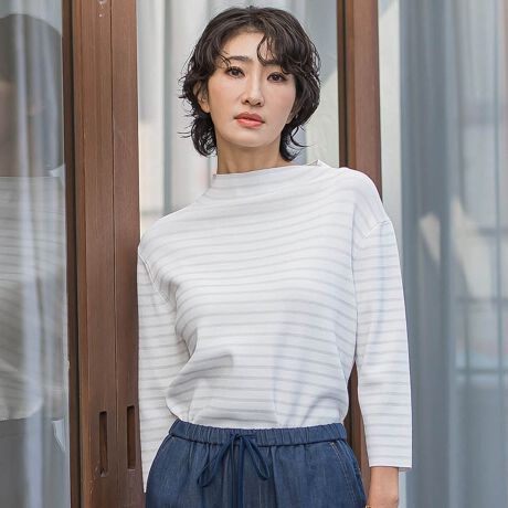 首元を上品に覆うモックネックは、顔周りをすっきりと知的な印象に見せ、ネックレスなしでも華やかな佇まいに。