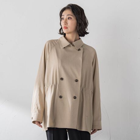 とろみのあるシャンブレー素材を使用したショートトレンチ。